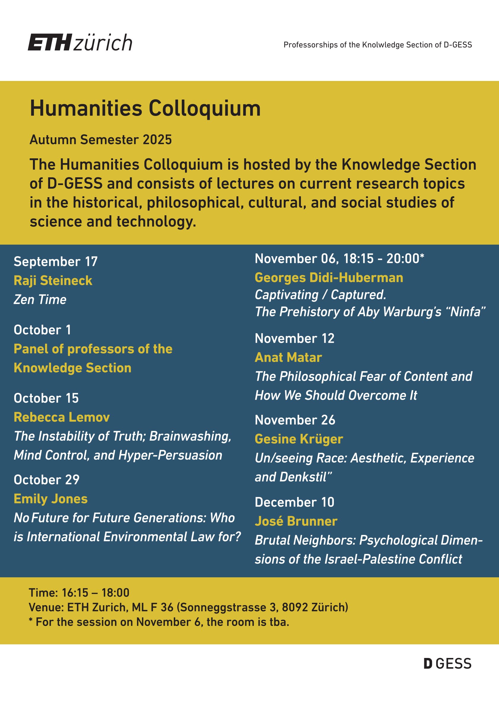 The Humanities Colloquium is hosted by the Knowledge Section of D-GESS and consists of lectures on current research topics in the historical, philosophical, cultural, and social studies of science and technology.