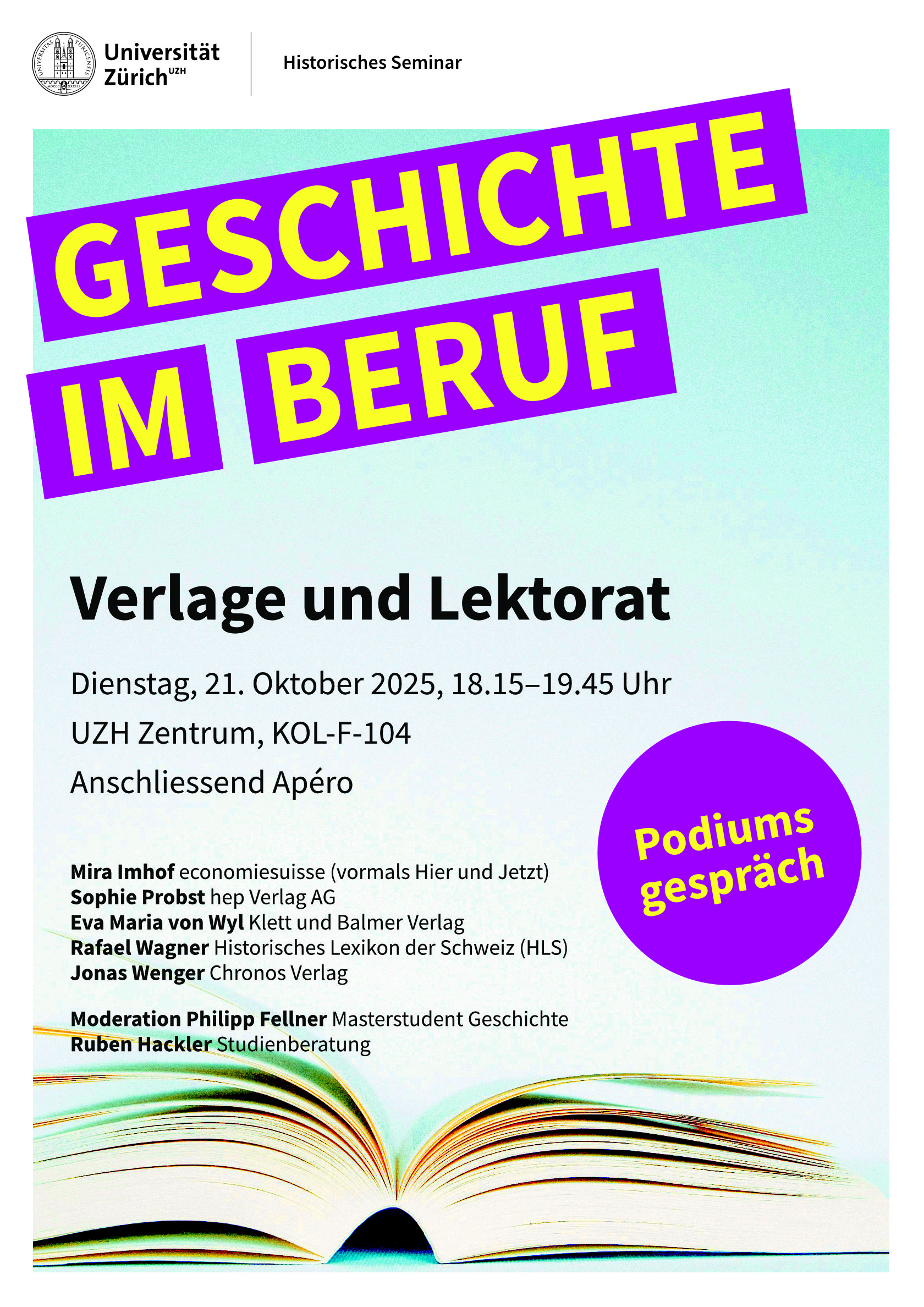 Das nächste Podiumsgespräch zum Berufsfeld "Verlage und Lektorat" findet am Dienstag, 21. Oktober 2025, von 18.15-19.45 Uhr im Raum KOL-F-104 mit anschliessendem Apéro statt: Anmeldung